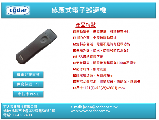 為了服務台灣市場,台灣可大微波科技公司努力為台灣客戶提供最先進的電子巡邏設備和巡邏解決方案,希望能為廣大客戶創造更高的價值。